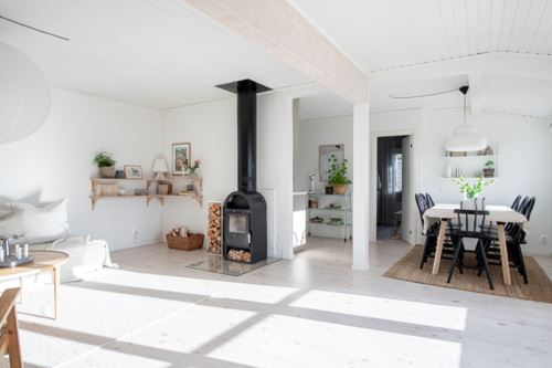 Vardagsrum: Ljust och luftigt vardagsrum med härligt öppen planlösning och mycket fint ljusinsläpp. Mysfaktor med braskamin som ger skön värme, laminatgolv och ljust målad vägg.