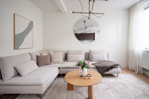 Vardagsrum: Vardagsrummet med fint golv och ljusa väggar upplevs luftigt med öppna ytor mot köket. En mycket socialt trevlig bostad.