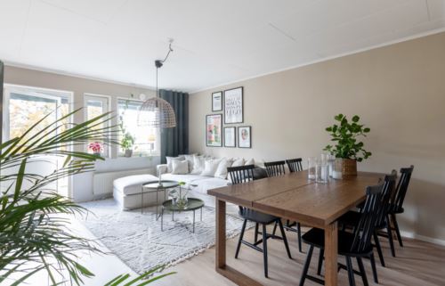 Bostaden har genomgående nya golv (2022) och väggar i behagliga, harmoniserande kulörer som skapar ett varmt och inbjudande intryck. Den välplanerade planlösningen erbjuder generösa sällskapsytor och gott om ljusinsläpp från flera väderstreck.
